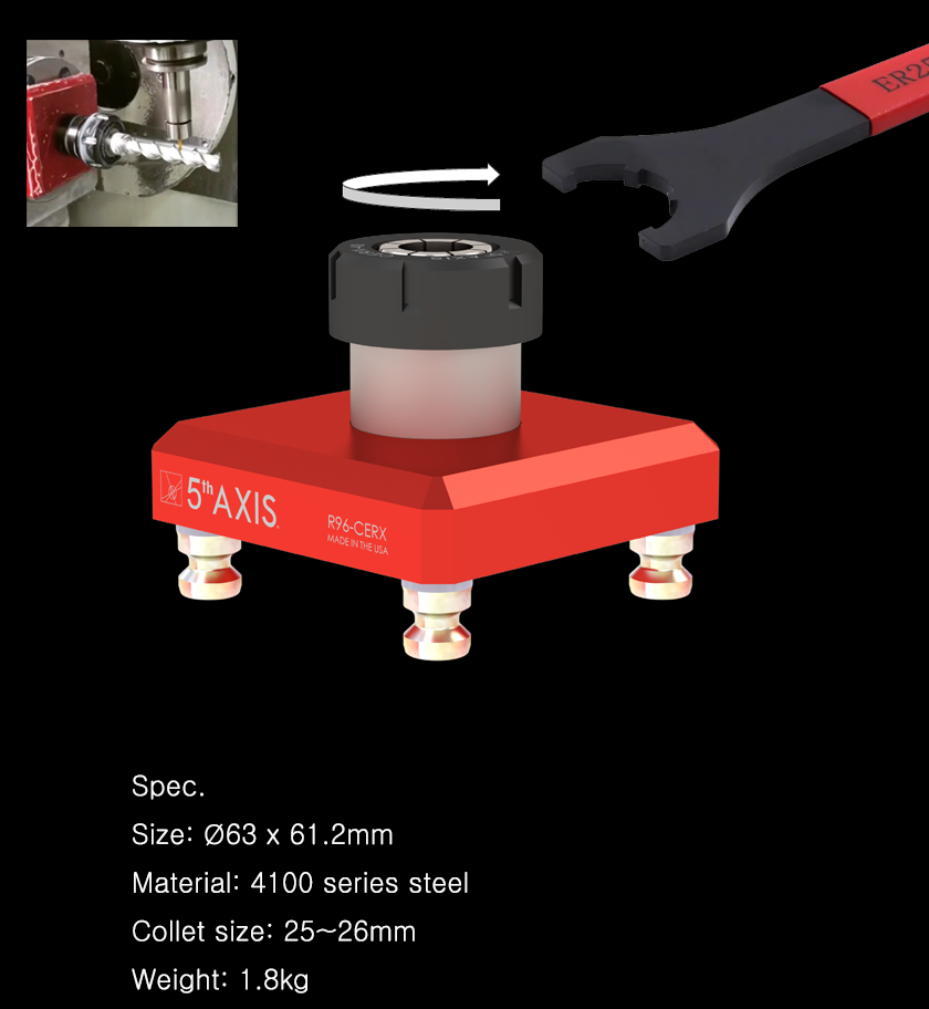 5th Axis RockLock 96mm 퀵 체인지 탑 툴링 시스템으로 가공의 미래에 투자하세요. 경쟁력을 유지하고 생산성을 높이며 가공 작업에서 뛰어난 결과를 달성하세요. 품질, 정밀성, 혁신에 대한 당사의 헌신을 신뢰하고 오늘 귀사의 가공 역량을 새로운 차원으로 끌어올리세요. R96-CERX-40은 수직 밀링에서 원형 공작물을 가공하는 데 이상적인 솔루션입니다. 이 고정 장치는 모든 표준 ER40 콜렛과 호환되므로 다양한 직경의 재고를 쉽게 클램핑할 수 있습니다. 본체는 엄격한 표준에 따라 경화 합금강으로 제조됩니다.
