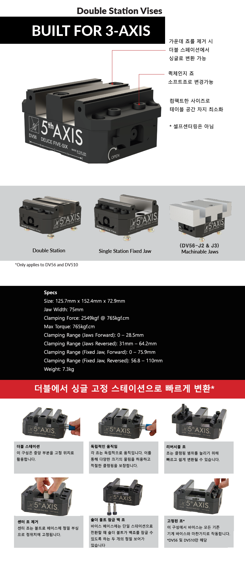 더블 스테이션의 장점: 클램핑 스테이션이 두 개인 DV56은 두 개의 작업물을 동시에 고정하여 정밀도를 떨어뜨리지 않고도 출력을 효과적으로 두 배로 늘릴 수 있습니다. 생산 공정을 간소화하고 설정 사이의 가동 중지 시간을 줄입니다.
