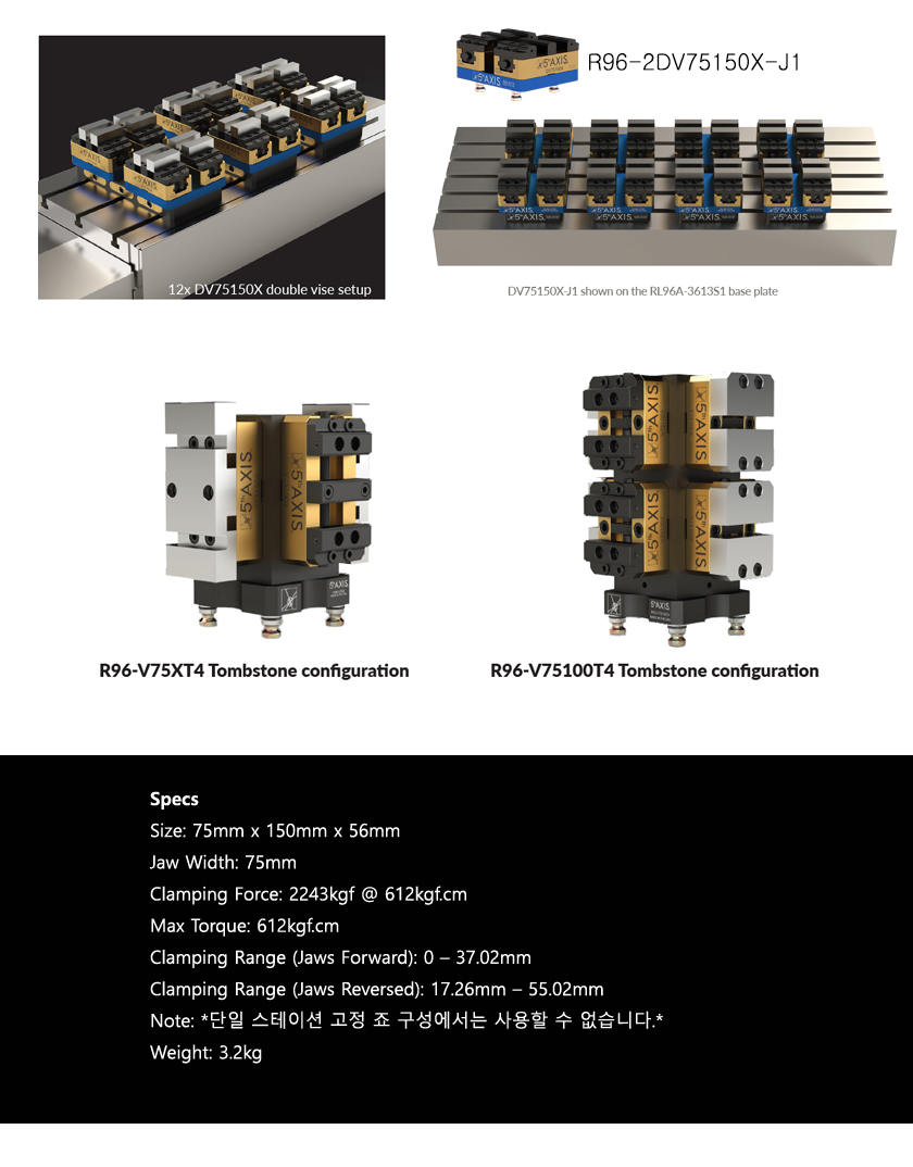 빠른 클램핑: DV75150X는 빠르고 쉬운 설정을 위해 설계되었습니다. 사용자 친화적인 디자인으로 몇 초 만에 작업물을 로드하고 고정하여 가공 공정을 신속하게 시작할 수 있습니다.