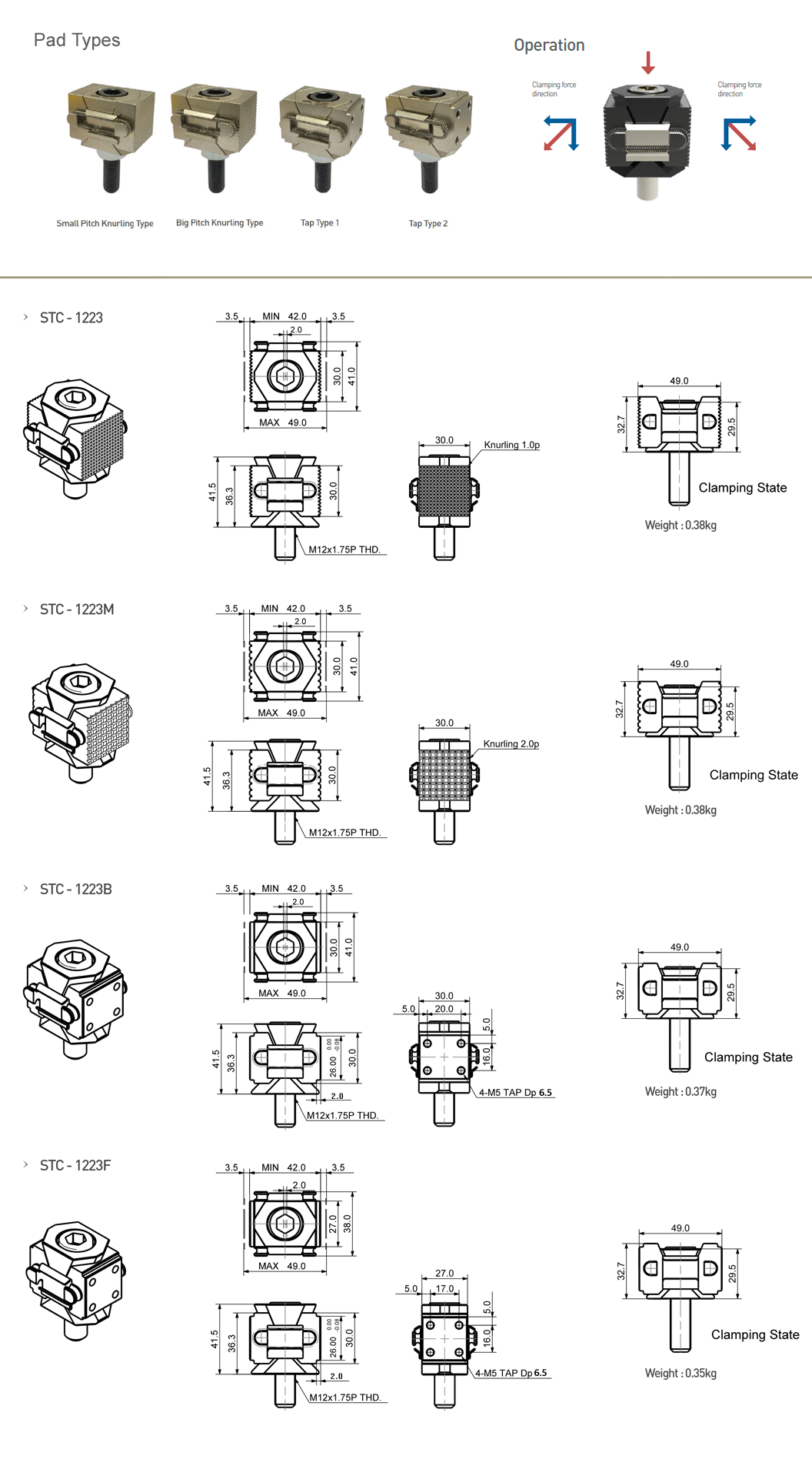 Model No. Pad Type Pad Movement(mm) Pad Width(mm) Bolt Size Clamping Force(max. kgf) Tightening Torque(max. kgf·cm) Weight(kg) 2D 3D PDF